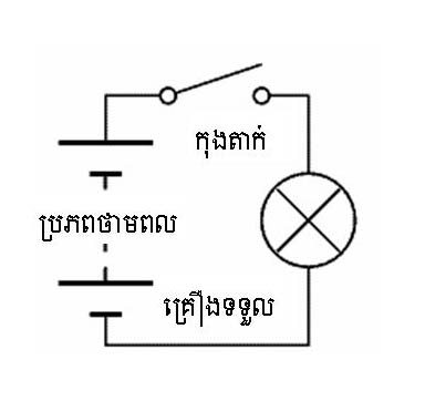 សញ្ញាណអំពីសៀគ្វីអគ្គីសនីក្នុងសៀគ្វីអគ្គីសនីមួយចែកចេញជា បីផ្នែក : ( 1 ) ប្រភពថាមពល , ( 2 ) កុងតាក់អគ្គីសនីបិទបើក , ( 3 ) និងគ្រឿងទទួល ។