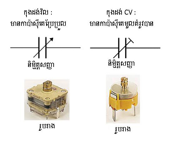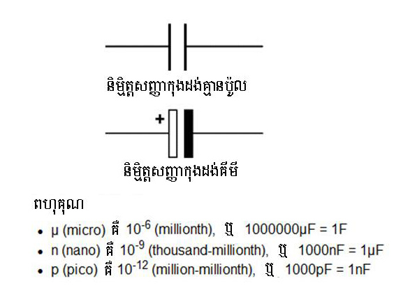 រូបគូរបង្ហាញអោយឃើញនិម្មិត្តសញ្ញារបស់កុងដង់ ។ ឯកតារបស់កុងដង់គឺ ផារ៉ាត ( Farad ) ប៉ុន្តែ គេច្រើននិយមហៅថាមីក្រូ ( Miro ) , ណាណូ ( Nano ) , ពីកូ ( Pico ) ។