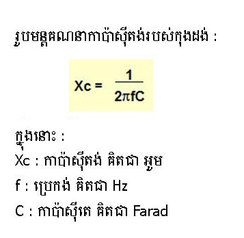 ពេលមិត្តយកភ្លើង AC មានប្រេកង់ f ទៅភ្ញោចលើកុងដង់មួយ ពេល នោះ កុងដង់ នឹង មាន ឥទ្ធិ ពលទប់ឃាត់ចរន្ត ។ កំលាំងទប់ឃាត់ចរន្តនេះ ហៅថា កាប៉ាស៊ីតង់ ។ ខាងក្រោមនេះ គឺជារូបមន្តគណនាកាប៉ាស៊ីតង់របស់កុងដង់មួយ :
