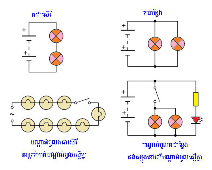 បណ្តារូបគូរខាងលើនេះ បង្ហាញពីរបៀបតបណ្តាអំពូលប្រឆែះតាមគំរូតជាស៊េរីនិងតជាខ្នែង ។ ពេលតជាស៊េរី នោះចរន្តអគ្គីសនីរត់កាត់អំពូលនឹងមានតំលៃស្មើគ្នា ហើយបើមានដាច់អំពូលណាមួយ នោះមែកទាំងមូលនឹងបាត់ចរន្ត អំពូលផ្សេងឯទៀតនឹងរលត់ ។ ពេលតជាខ្នែង នោះកំរិតតង់ស្យុងនៅលើបណ្តាអំពូលនឹងស្មើគ្នា ហើយបើមានដាច់អំពូលណាមួយ នោះអំពូលផ្សេងទៀតនឹងនៅតែបានផ្តល់ចរន្តនិងនៅតែភ្លឺ ។ ចំពោះការតជាស៊េរី នោះសៀគ្វីនឹងបាត់ចរន្តពេលមានគ្រឿងបរិក្ខាណាមួយបានត្រូវឆ្លង ។