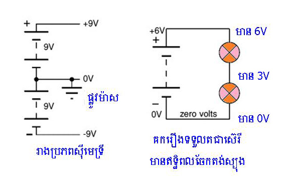អាស្រ័យទៅនឹងវិធីដាក់ផ្លូវម៉ាស ដែលផ្លូវម៉ាសមានកំរិតតង់ស្យុងកំណត់គឺ 0V ។ បើសិនដាក់ផ្លូវម៉ាសនៅចំណុចកណ្តាល នោះយើងនឹងមានប្រភពស៊ីមេទ្រី + 9V និង – 9V ។