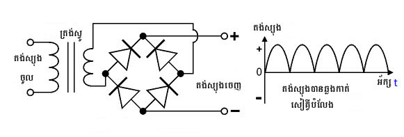 ក្នុងរូបបង្ហាញអោយឃើញអំពីគោលការណ៍ដំណើរការរបស់ស្ពានបំលែងភ្លើងប្រើឌីយ៉ូត