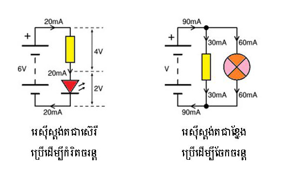 វិធីទី 2 : ផ្គុំជាខ្នែង ( ក្នុងរូប ) គេប្រើរេស៊ីស្តង់មួយតជាខ្នែងដើម្បីចែកចរន្ត ធ្វើអោយថយអាំងតង់ស៊ីតេចរន្តអគ្គីសនីរត់កាត់អំពូល ។