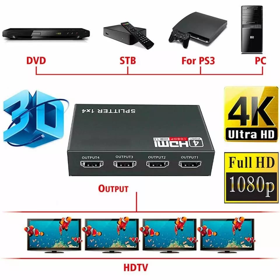 2Ways HDMI Splitter Sharing 1 to 4 : input x1 output x4 BOX Port 3D – HD – Amplifier Multiple4 TV Screens.