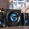 Colorful lights with music flicker jump, bring you a different game experience. When you wanna go to bed, dim the lights with volume knob on the side of woofer or down the volume on the phone. Humanization design gives you comfortable experience.